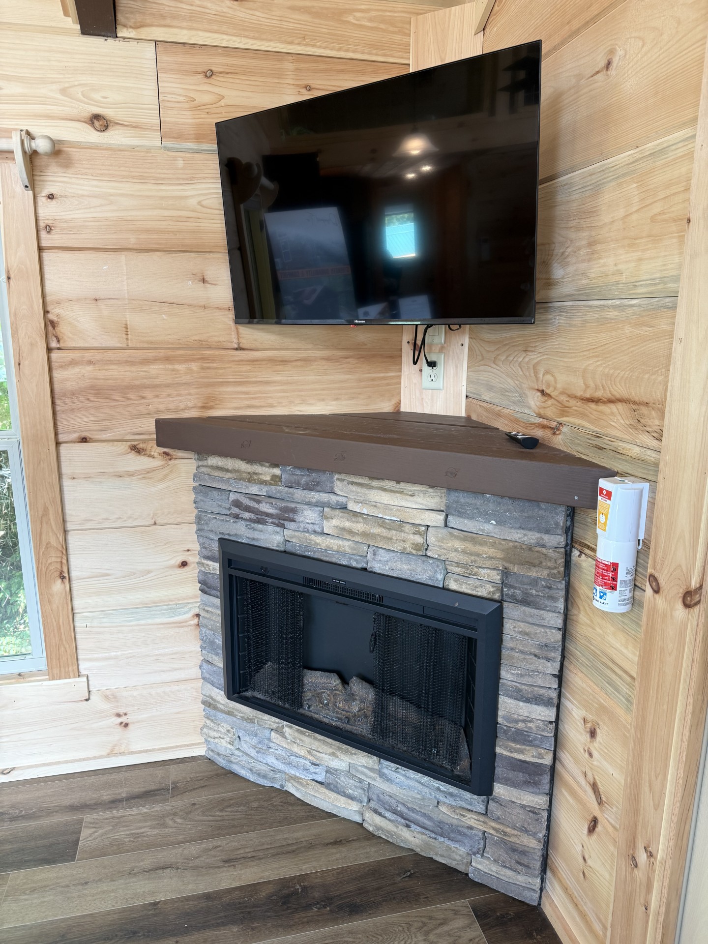 - Electric fireplace with rock front