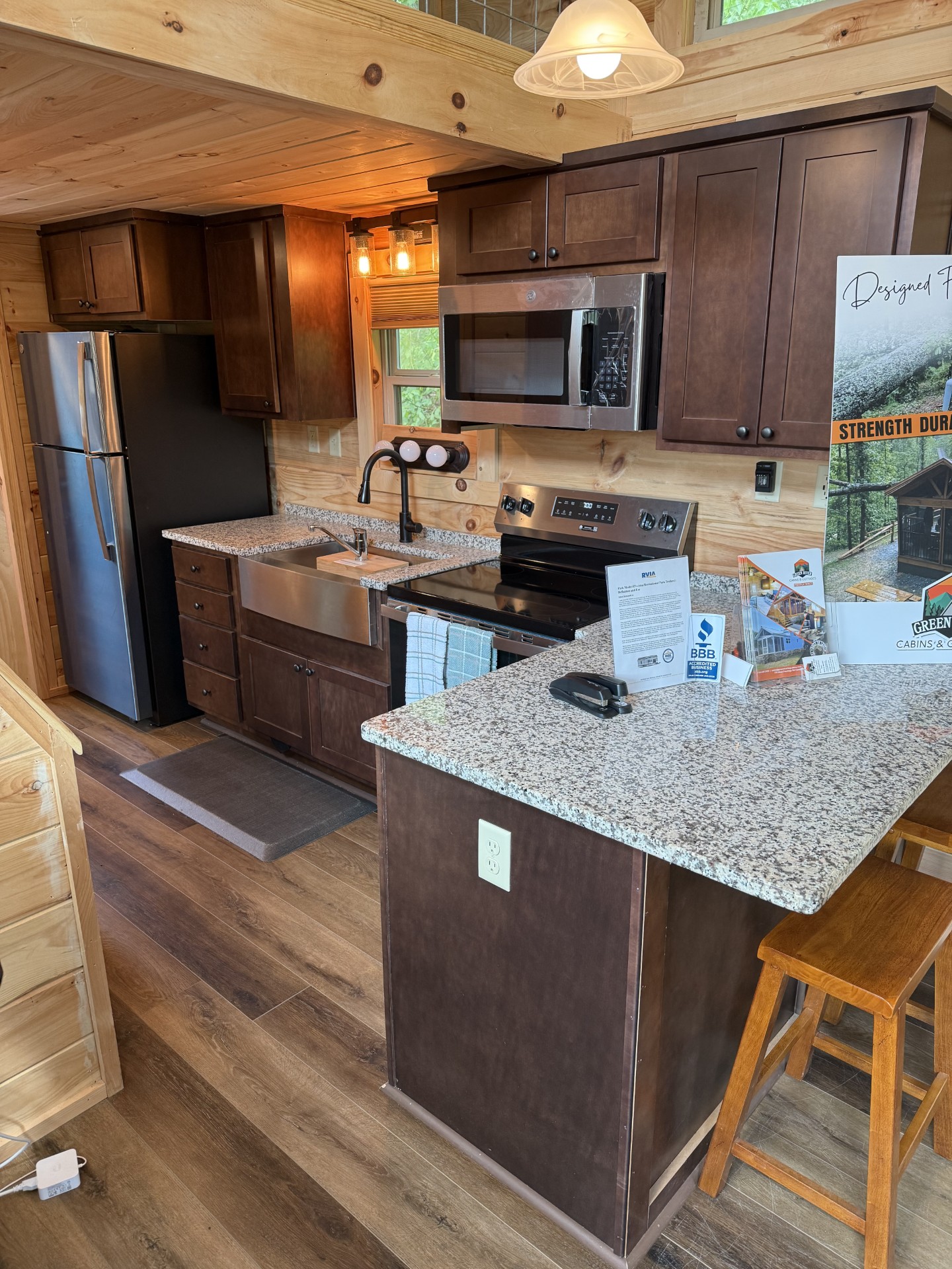 - Dishwasher, 30” electric range, apron front farm sink, stainless steel appliances